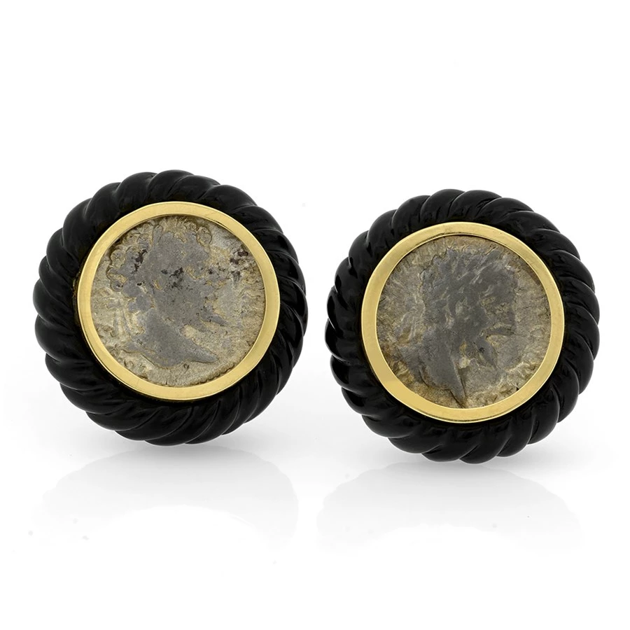 Using relics from Ancient Rome, Septimius Severus silver coins (27 BC – 476 AD) are handset into 18k yellow gold, surrounded by fluted carved onyx bezels. Handmade in America. Exclusively at Scully & Scully.