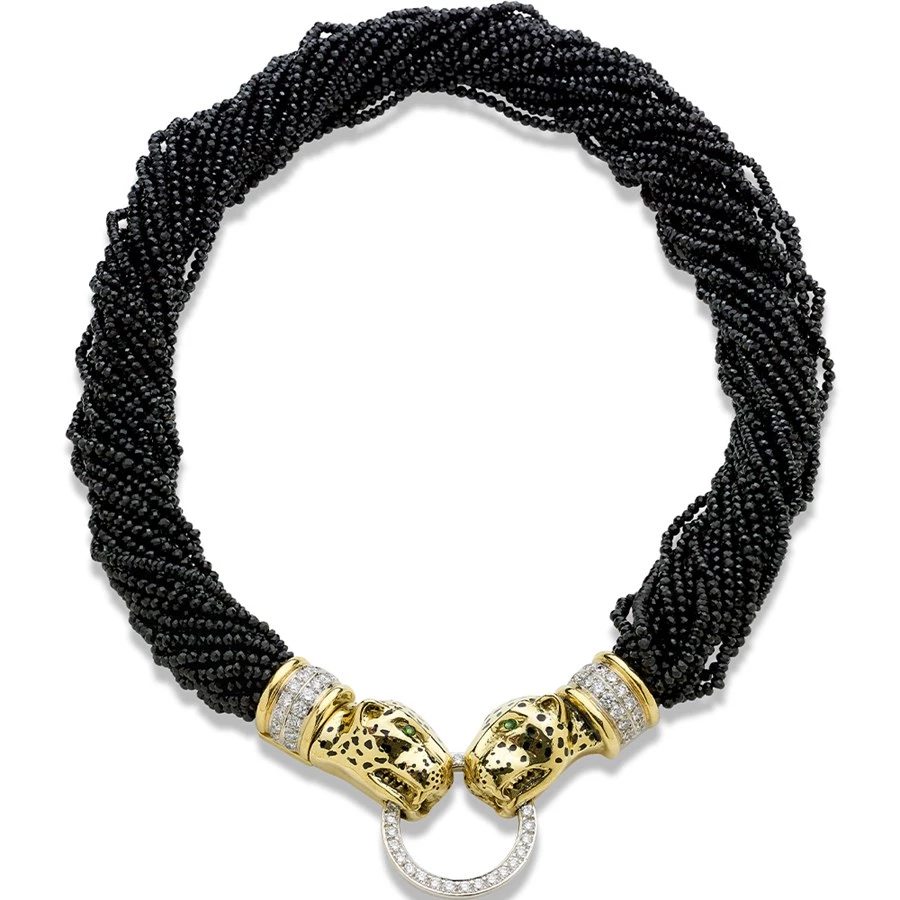 A bold and daring yet classic cheetah head design, this is a timeless and vibrant bracelet set into 18k yellow gold. It consists of diamonds (0.90ct) and spinel gemstones. The eyes are faceted gemstones. Handmade in America.