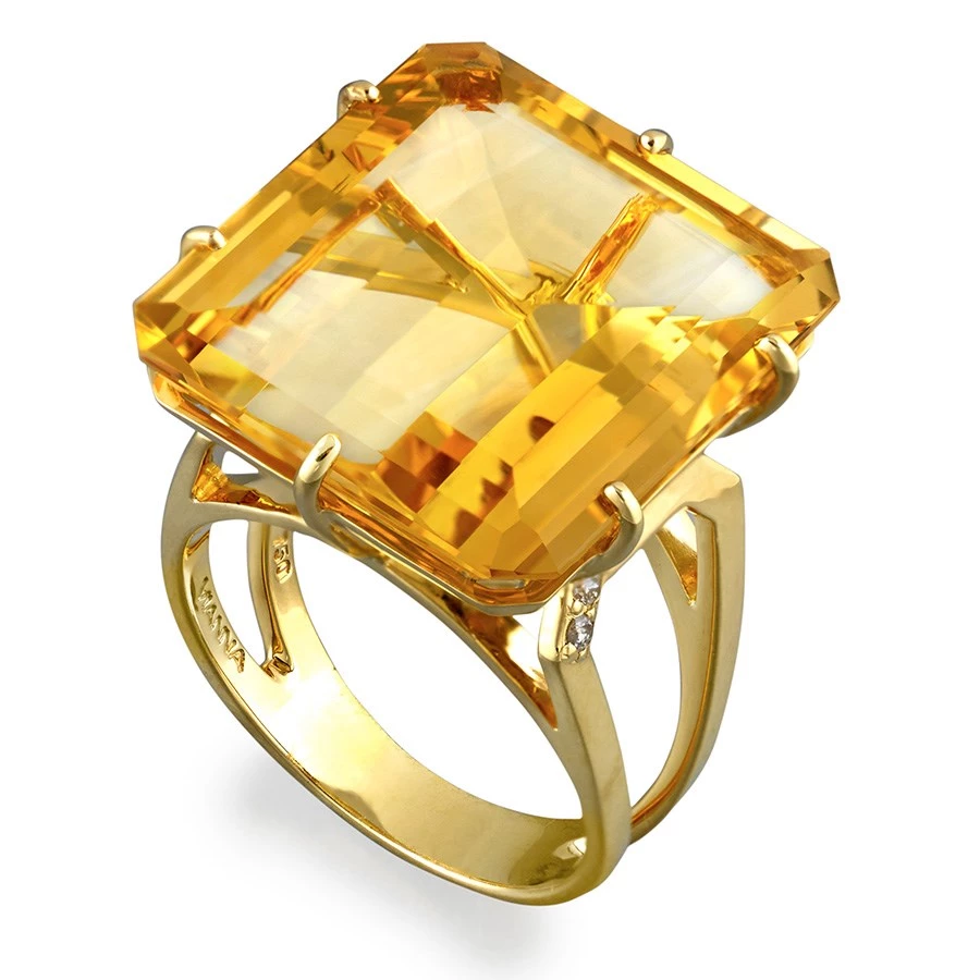 Beautiful square cut stones are set into 18k yellow gold and accented with diamonds (0.048 tcw) for a simply stylish finish. With a choice of yellow citrine or green prasiolite, match the ring to your outfit. Handmade in Brazil.