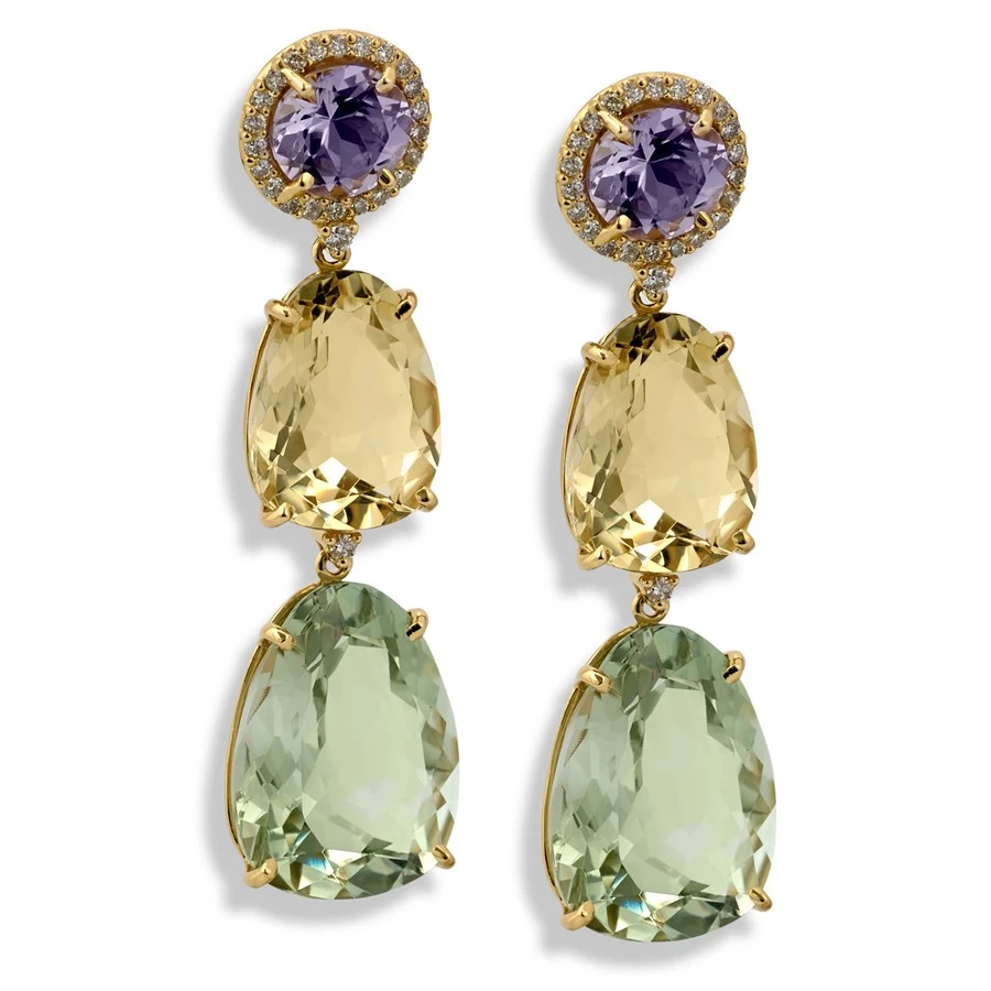 Gorgeous three-stone earrings are purple amethyst, yellow light citrine and praziolite drops set into 18k yellow gold. Amethyst at top is ringed with diamonds (0.312 tcw). Handmade in Brazil.