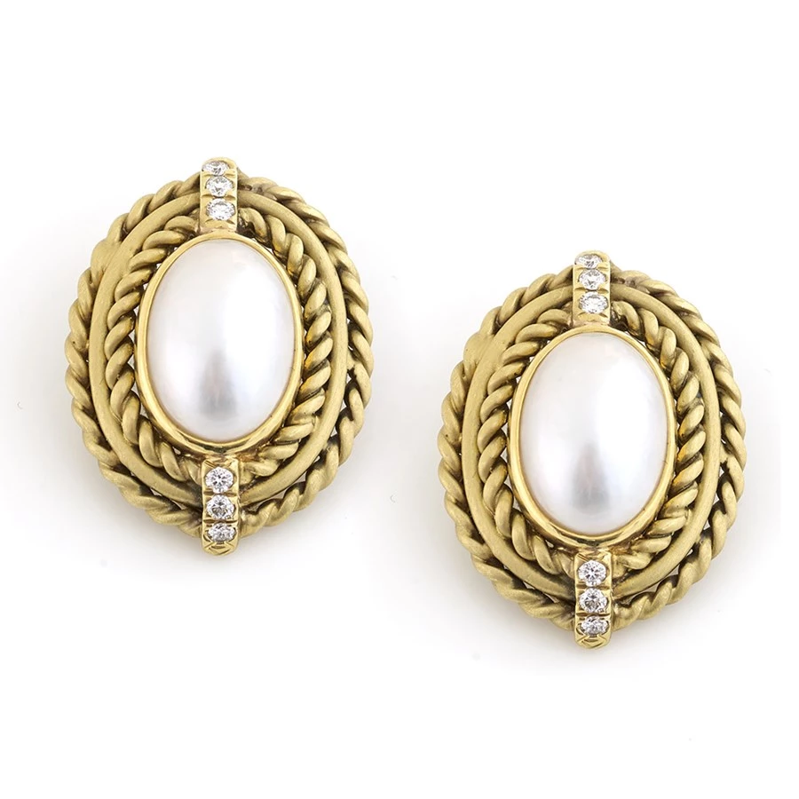 These gorgeous earrings consist of cultured pearl cabochons ringed with three halos of 18k yellow gold, two of which form intricately twisted ropes. Each earring is accented with three pave diamonds, handset into gold at the top and bottom of the earrings. Handmade in America.