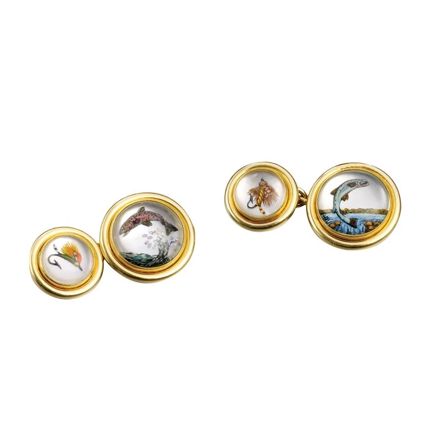 Rock crystal is handcarved from behind, then handpainted with oil paints. Crystal is then backed with mother of pearl and set in 18k gold. Handmade in England. Quail-Pheasant and Ducks have cartridge closures; Leaping Trout have chains.