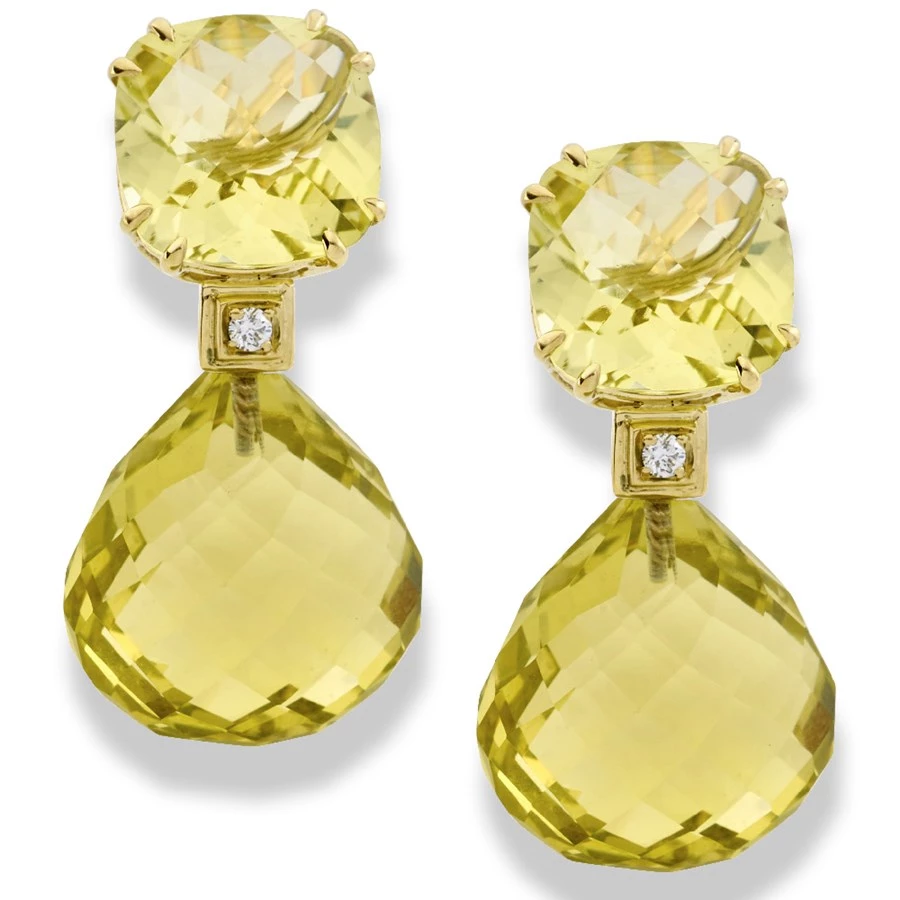 These beautiful drop earrings brighten any day with lively cushion-cut lemon citrines with a lemon citrine drop. The cushion-cut citrine is prong-set by hand into 18k yellow gold, which also connects the drop and is accented with a fiercely glittering diamond (0.10 tcw). Handmade in America. Exclusively at Scully & Scully.