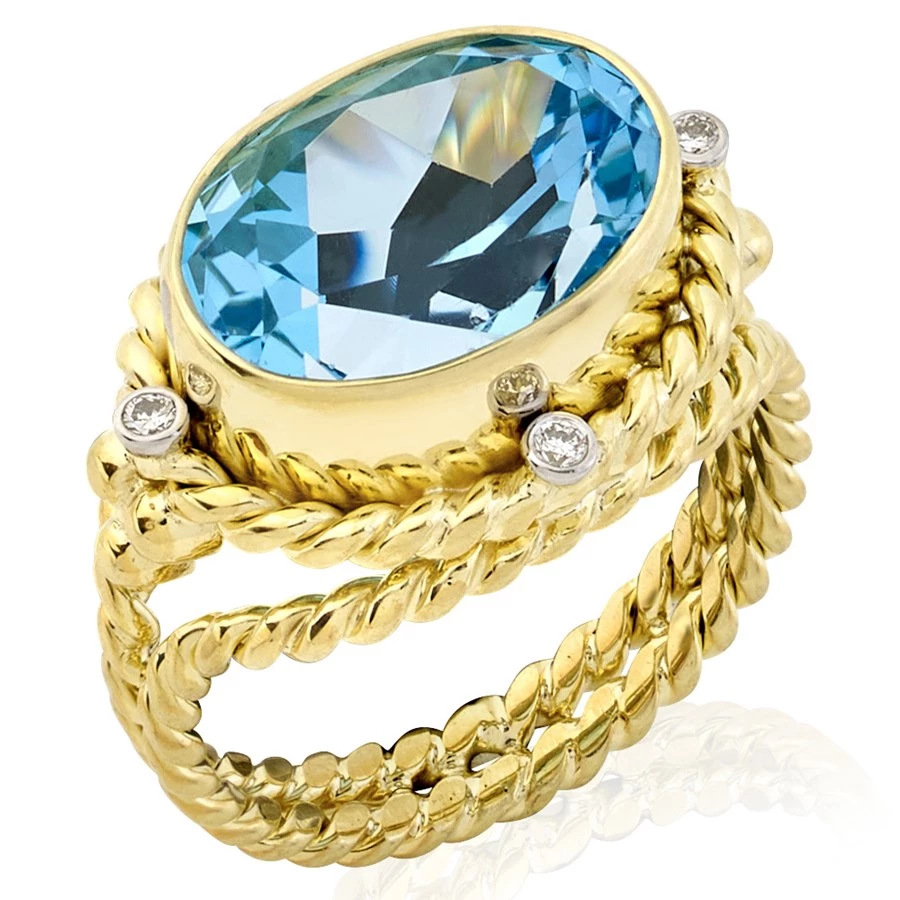 Unique ring handcrafted of 18k yellow gold holds one generously-sized bezel set oval faceted blue topaz, accented by four glittering diamonds (.08 tcw) for understated glamour. While the gorgeous blue topaz is undoubtedly the star of this ring, the 18k yellow gold is given equal attention and handtwisted into a beautiful rope design. Handmade in America.