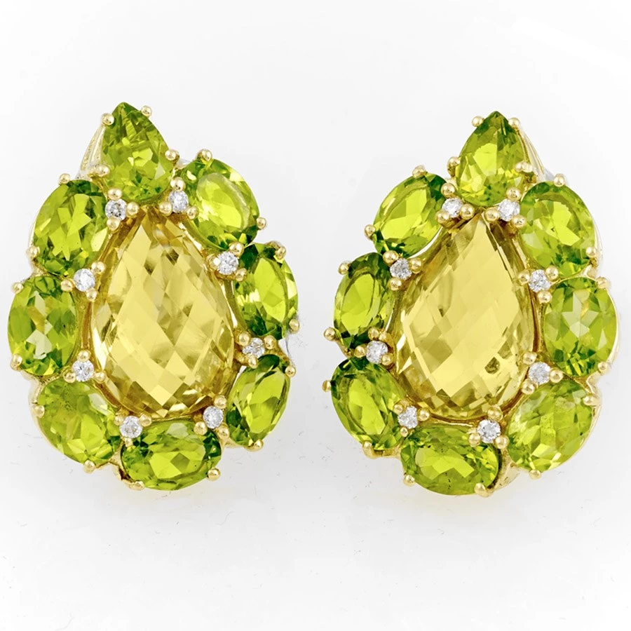 Seven oval faceted peridot gemstones and one pear peridot are prong-set by hand into 18k yellow gold, accented with eight glittering diamonds (0.32 tcw) creating an unusual halo around a stunning large lemon quartz gemstone. Handmade in America.