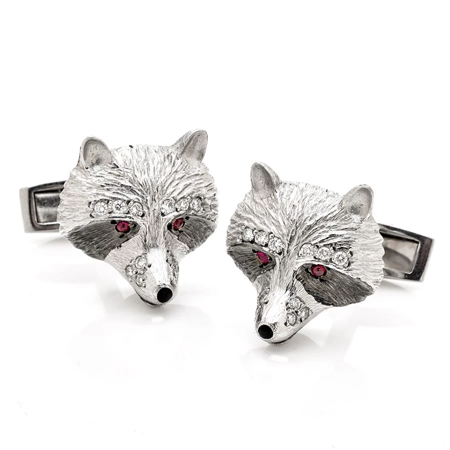 18k yellow and white gold. Ruby eyes and black onyx nose. T-bar closures. Raccoons have diamonds (.29 tcw) over the eyes and black rhodium markings. Handmade in England. Exclusively at Scully & Scully.