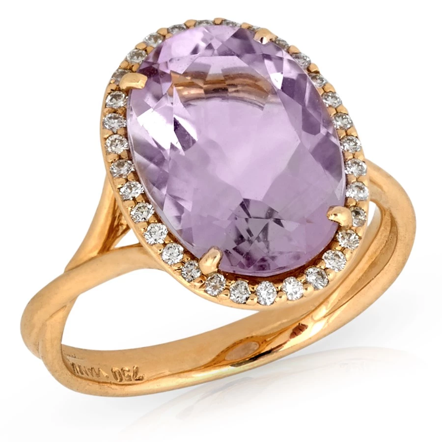 This mesmerizing 18 karat rose gold ring is centered around a brilliant oval cut pink amethyst (4.95 tcw) surrounded by a halo of pave diamonds (0.224 tcw). All handset into rose gold for a warmer finish than traditional yellow gold. Handmade in Brazil.