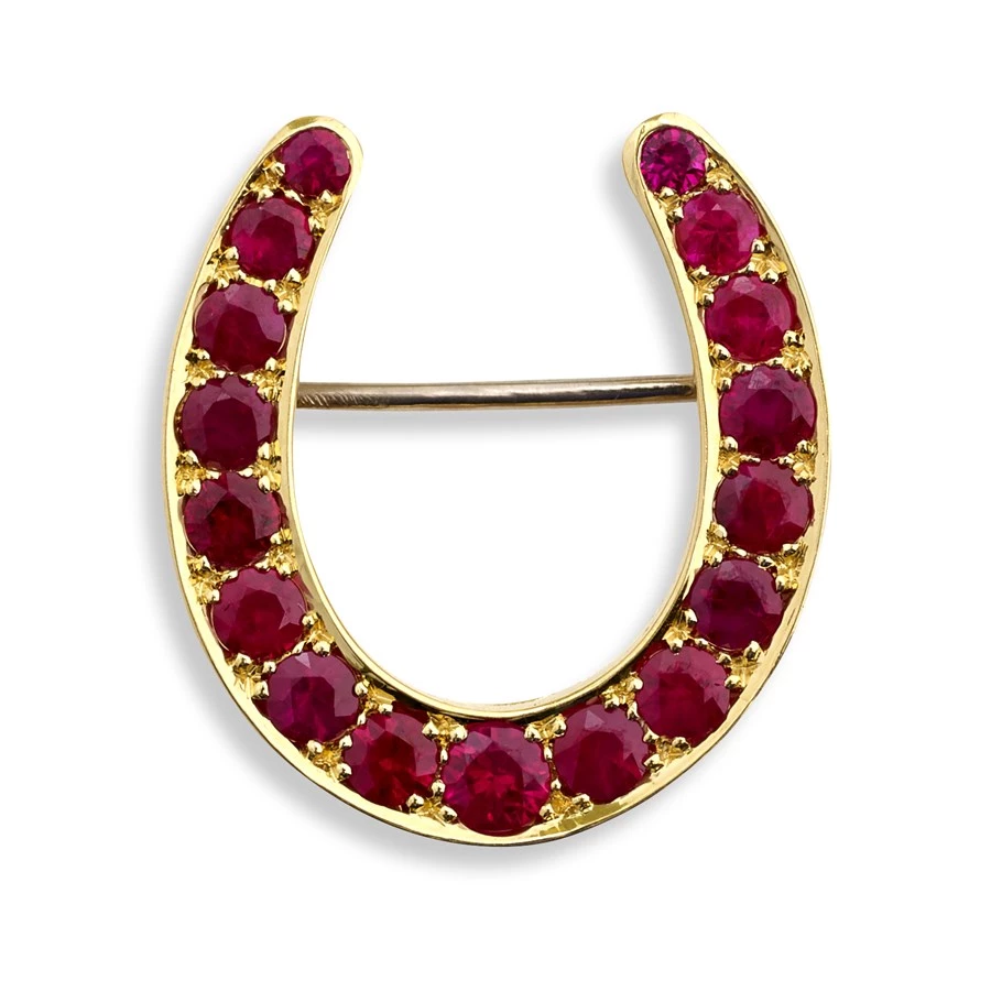 An exquisite piece featuring rubes along a horseshoe form, the perfect gift for any horse riders or aficionados of the sport. The shoe form is made of 18k rose gold. Handmade in England. Exclusively at Scully and Scully.