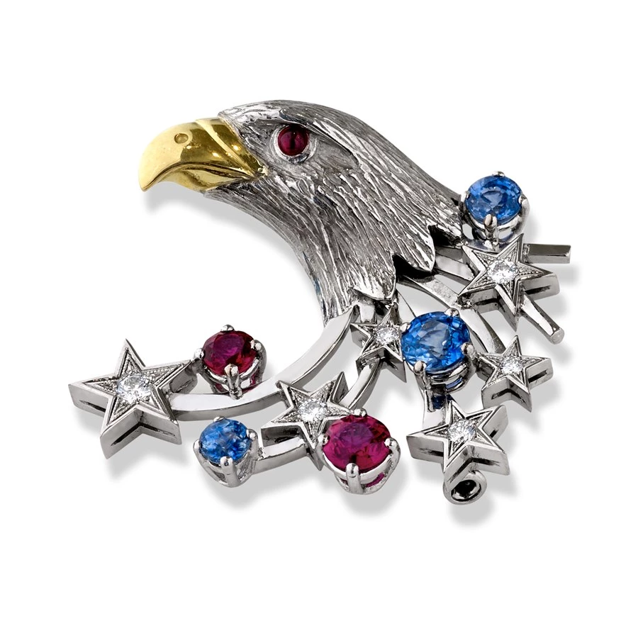 Featuring dazzling 18k gold, deep sapphires (.32 cts), resplendent rubies (.74 cts), and glistening diamonds (.27 cts), this American Eagle Pin is a stunning display of patriotism. A perfect addition to any jewelry collection. Exclusively at Scully & Scully.