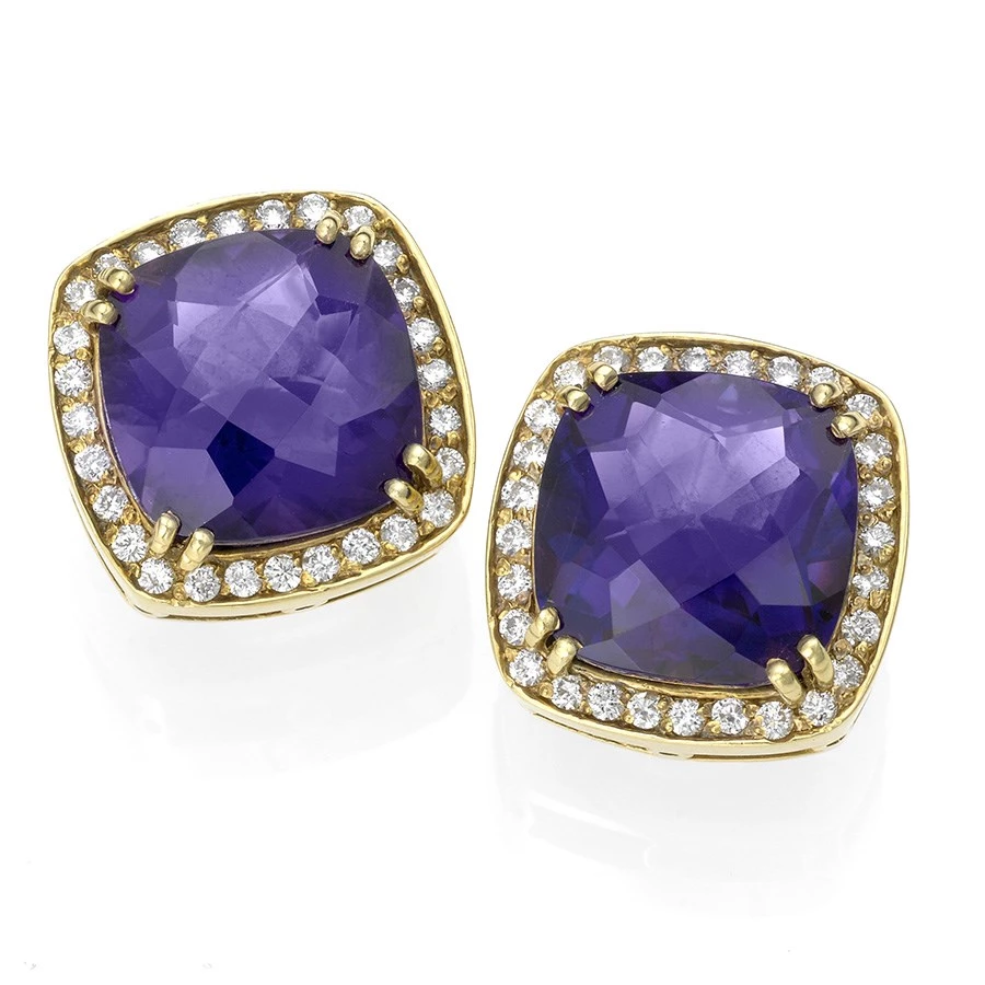 A dazzling set of square earrings featuring large cushion-cut amethysts in a brilliant 18k gold and diamond border. Each earring has twenty-eight diamonds (1.12 tcw). Handmade in America.
