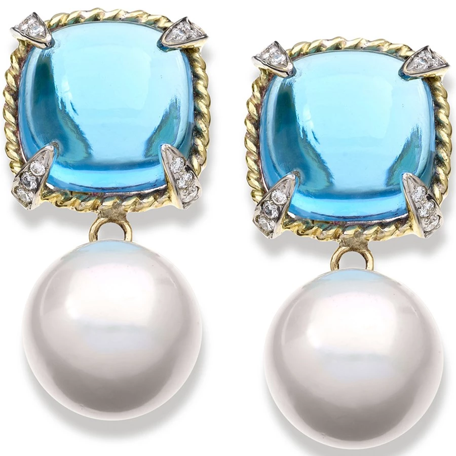 These beautifully balanced earrings feature serene Swiss blue topaz (33.12 tcw), accented with diamonds (0.36 tcw) prong-set by hand into 18k yellow gold twisted rope bezels. The cultured pearls measure 12mm each. Handmade in America. Exclusively at Scully & Scully.