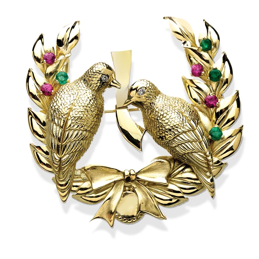 Handcrafted of 18k yellow gold, the spirit of the season is celebrated in this elegant pin. Two turtle doves boast bezel-set diamond eyes (0.03 tcw) and hold a ribbon between them. The fabulously hand-textured birds rest upon a wreath accented with emeralds (0.28 tcw) and rubies (0.36 tcw), entirely prong-set by hand. Handmade in America. Exclusively at Scully & Scully.
