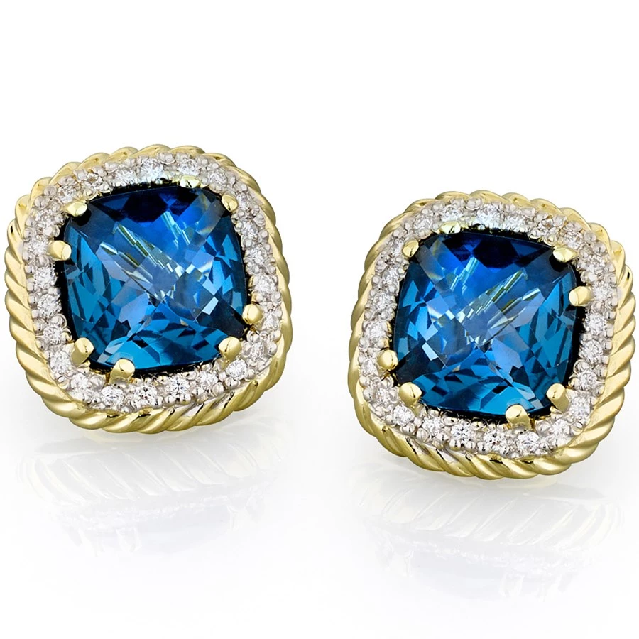 Gorgeous earrings feature two stunning London Blue Topaz gemstones (14 tcw) prong set in 18k yellow gold. Each London Blue Topaz is surrounded by a halo of pave diamonds (0.72 tcw) for a glittering finish, framed by hand twisted 18k yellow gold ropes. Handmade in America.
