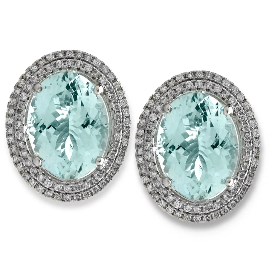 The elegant 18K White Gold Aquamarine and Diamond Halo Earrings feature a double band of diamonds (1.23 tcw) surrounding the central gem (16.53 cts) for a beautiful halo effect. The brilliance of the diamonds is complemented by the bright faceted aquamarine for a uniquely impressive piece. Handmade in America.