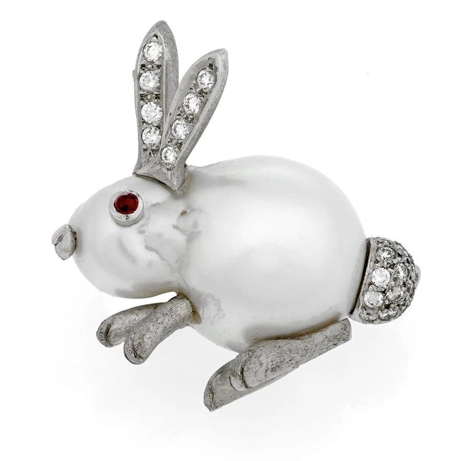 Adorable sitting rabbit pin has a baroque pearl for its body and head, 18k white gold for its ears, tail, legs and nose, and ruby eyes, as well as diamonds (0.35cts) set into its ears and tail. Handmade in England. Exclusively at Scully & Scully.