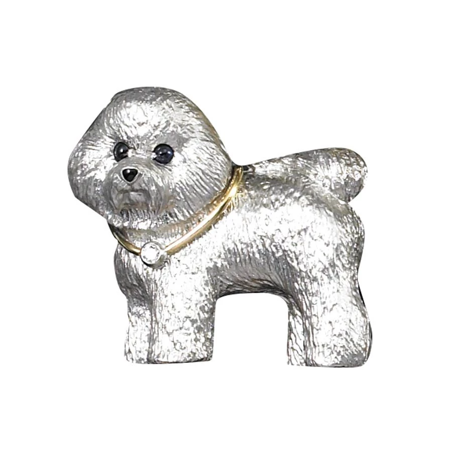 18k textured white gold Bichon Frise pin with sapphire eyes, onyx nose, gold collar with diamond. Handmade in England. Exclusively at Scully & Scully.