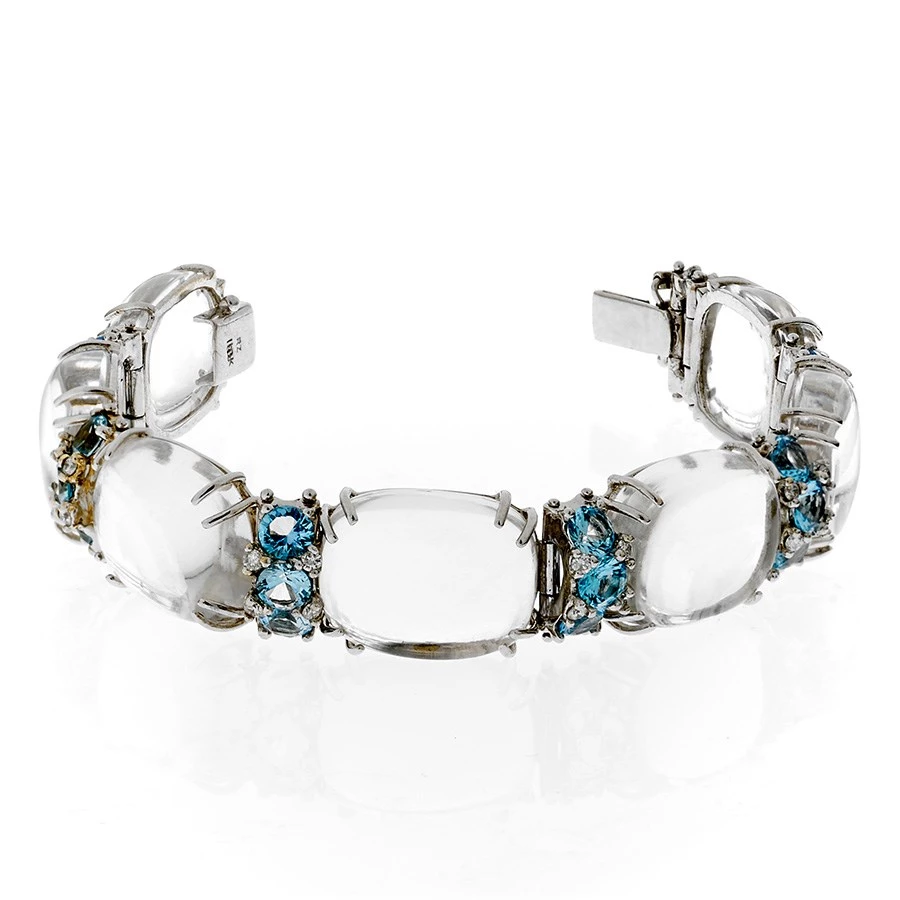 A divine bracelet unrivaled in its purity and majesty. The bracelet consists of seven carved cabochon crystals, as well as sky blue topaz and 0.84 carats of brilliant diamonds, all set in 18k white gold. Handmade in America.