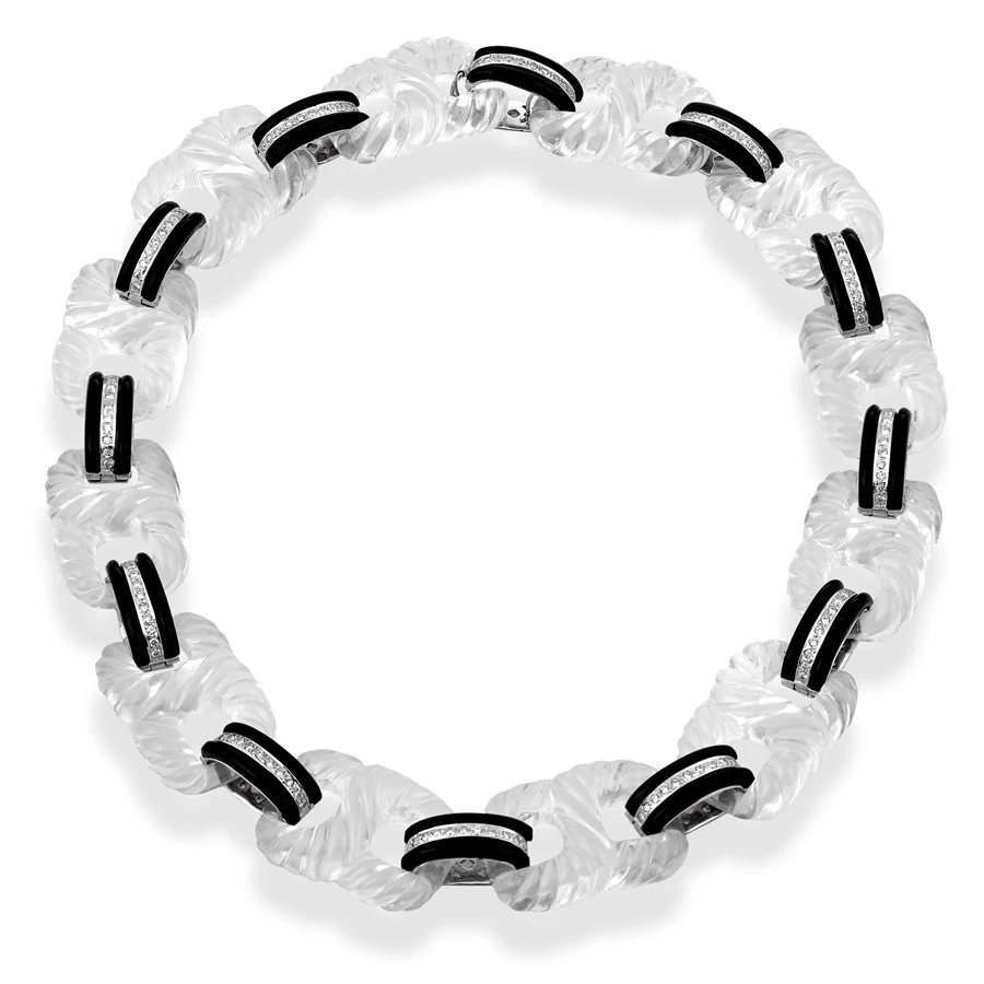 Add a touch of mystery and magic to your everyday wear with this beautiful necklace in 18k white gold and carved black onyx. It has 12 carved crystal sections and 12 black onyx connecting the bar stations with 1.98 cts pave diamonds. Handmade in America.