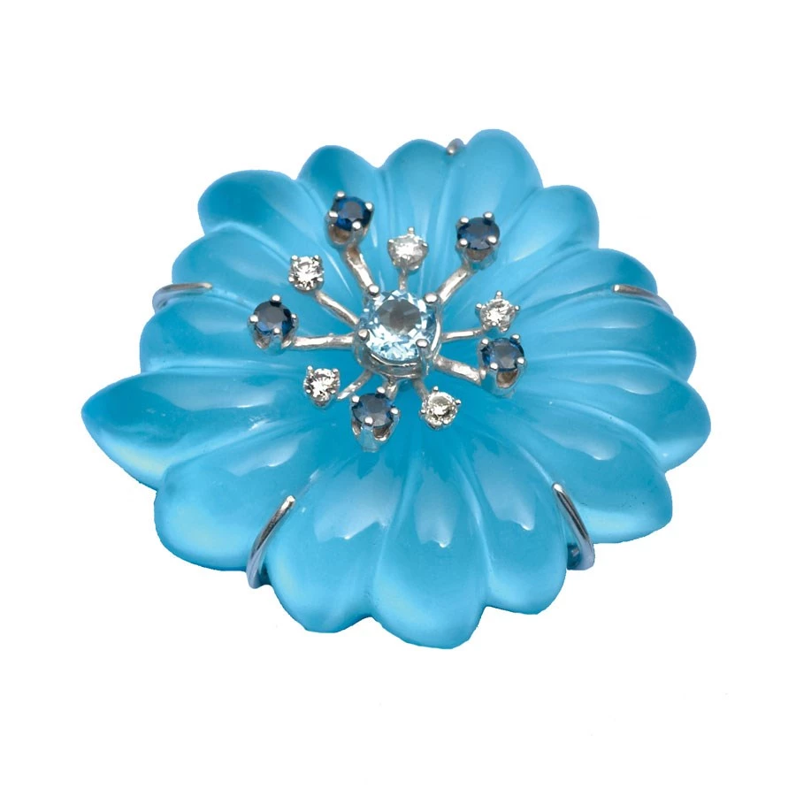 Carved crystal flowers with reconstructed turquoise doublets set into 18k white gold with prong-set faceted sapphires, diamonds (.25 tcw) and blue topaz centers. Handmade in America. Exclusively at Scully & Scully.
