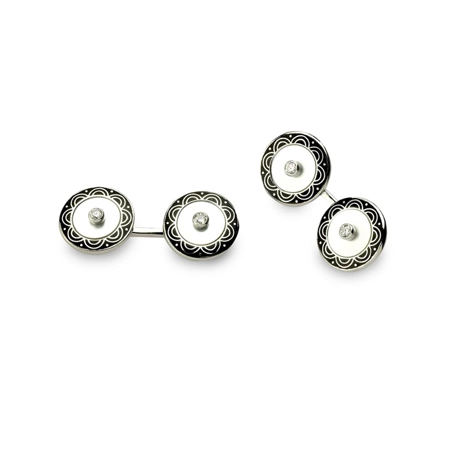 Pair them with a crisp, cuffed shirt and your finest suit, these are 18k white gold fetter link cufflinks with diamond centers and black enamel detail.