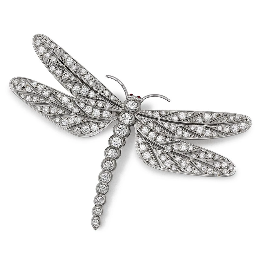 An exceptional dragonfly pin, handcrafted from 18k white gold and set with pave diamonds (2.16 cts) and ruby eyes. Handmade in England. Exclusively at Scully & Scully.