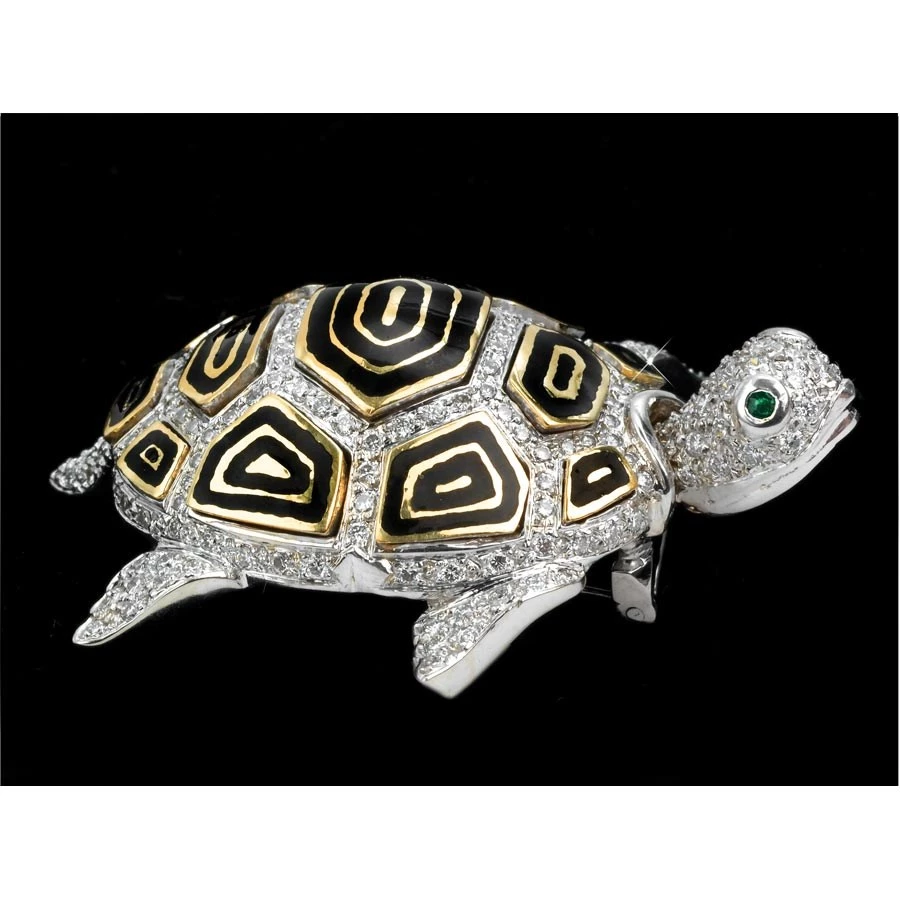 Brilliant turtle decked in diamonds (1.76 tcw) and enamel, set in 18k white gold with an emerald eye. The head even moves! Handmade in America.