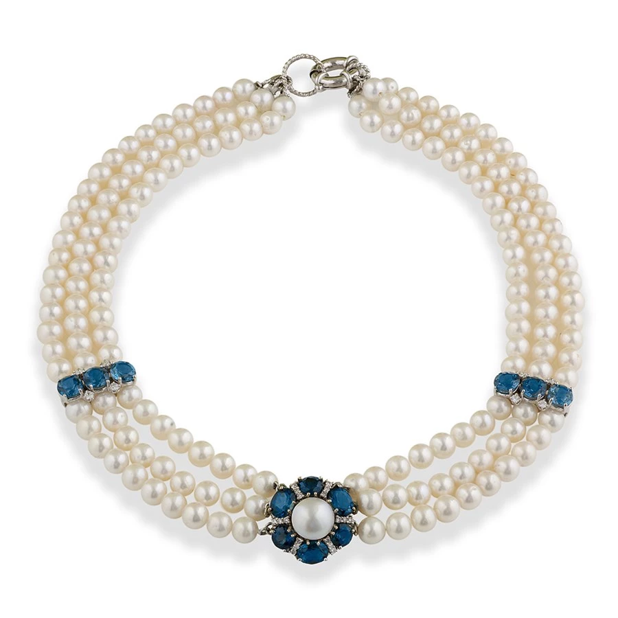A gorgeous three strand pearl necklace with London blue topaz junctions and a flower center featuring a large pearl, surrounded by London blue topaz and diamonds. A true testimony to exquisite jewelry craftsmanship, the piece boasts the finest pearls and is an absolute beauty, to be admired by every onlooker. Handmade in America.