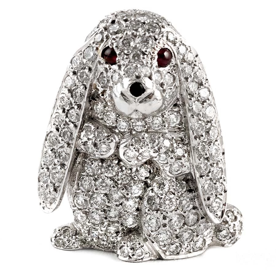 With .91 tcw diamonds set into 18k white gold, lop-eared rabbit proudly sports ruby eyes and onyx nose. Handmade in England. Exclusively at Scully & Scully.