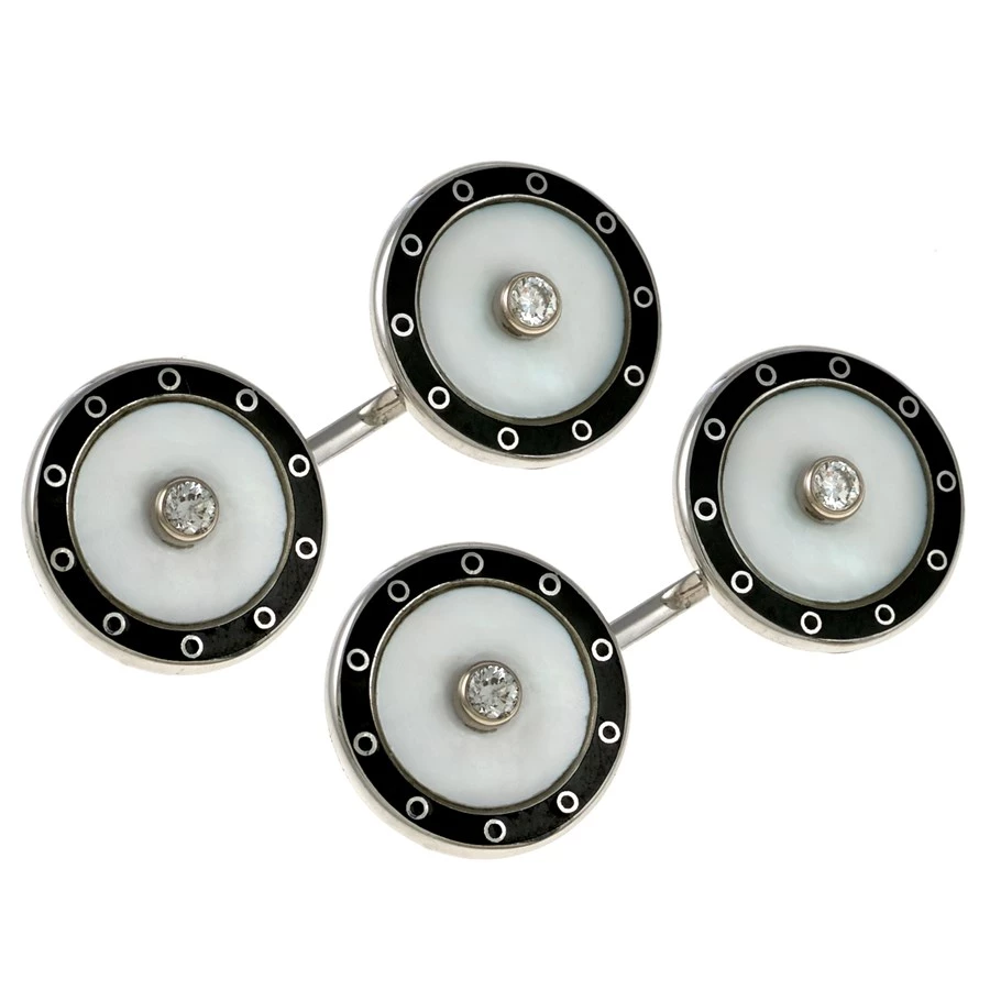 Classic 18k white gold cufflinks with soft mother of pearl inlay and diamond center (0.2ct). Border is black enamel with attractive circle pattern. Handmade in England.