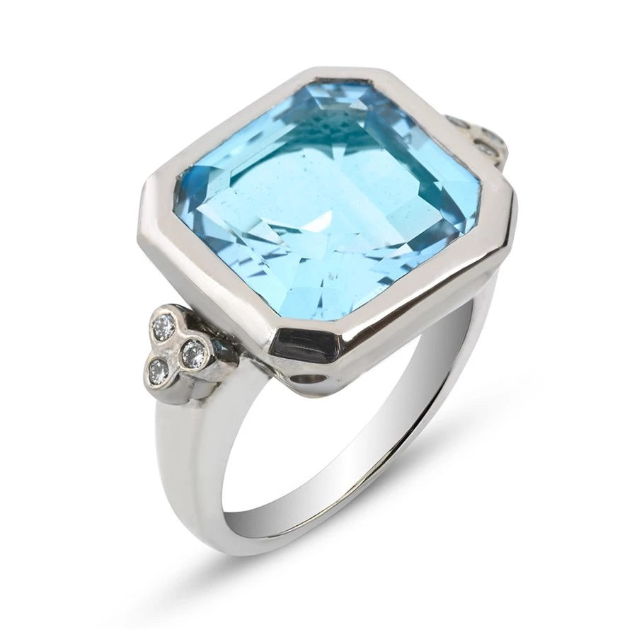 Stunning blue topaz ring hand-cut into a beautiful octagon and set into 18k white gold. The shoulders are enhanced with a trifecta of glittering round cut diamonds (0.12 tcw). Handmade in America.