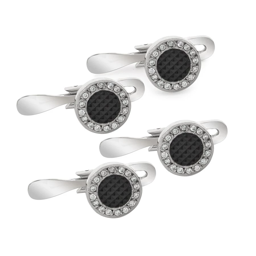 Each timeless stud features a rich handcarved and polished onyx center, set into 18k white gold surrounded by a halo of prong-set pave diamonds. Handmade in England.