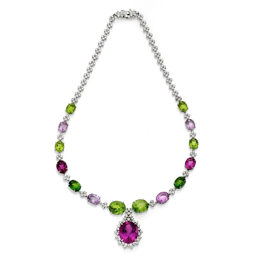 A truly divine pendant necklace fit for a princess. Crafted from 20.83 grams of 18k white gold, 15 rainbow Paraiba tourmalines (43.2 tcw), and an astounding 207 brilliant diamonds for a total diamond weight of 4.45 carats. Handmade in Brazil.