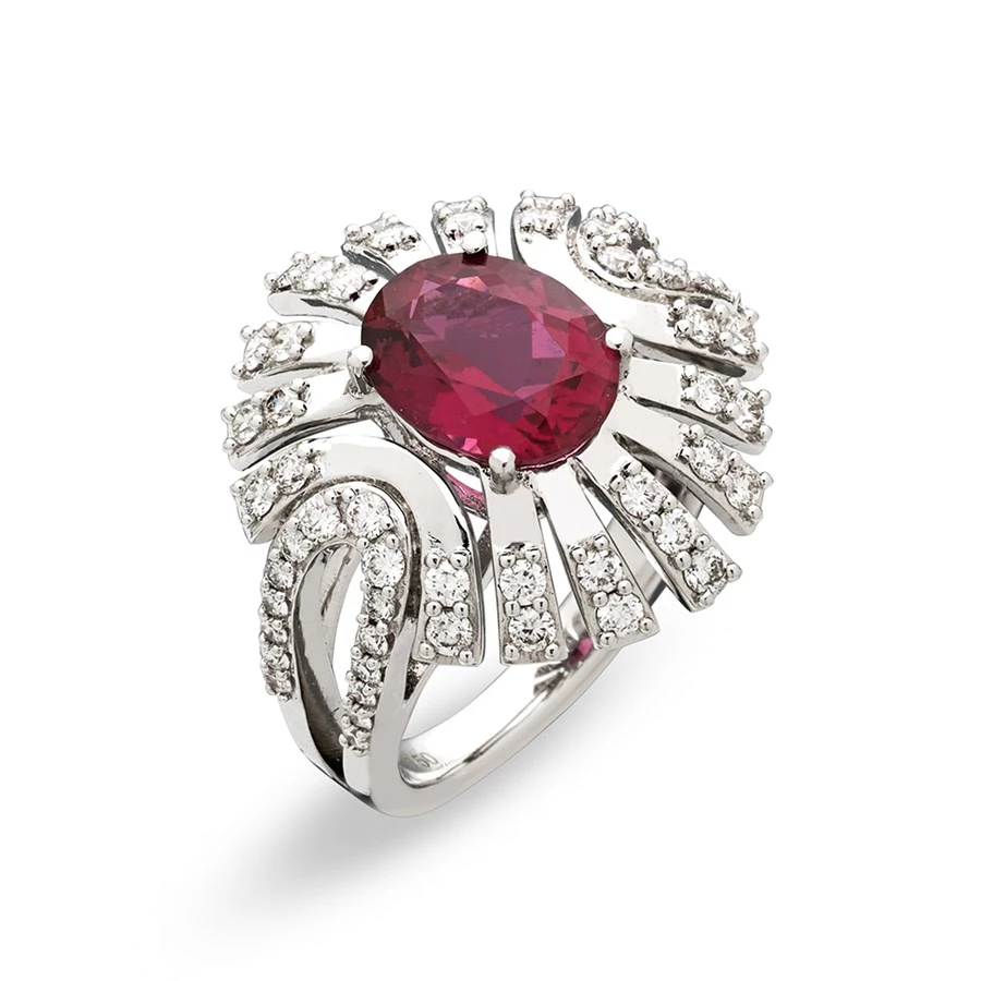 An exquisite statement ring, with a rubelite (2.57 tcw) as its central focus, adorned with diamonds (0.952 tcw). The base is an elegant 18k white gold. Handmade in Brazil.