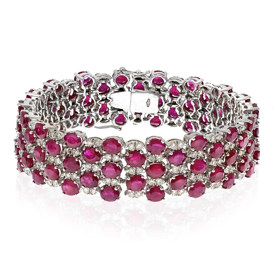 Simply stunning bracelet boasts a checkerboard design with alternating faceted round rubies (37.18 tcw) and oval glittering diamonds (4.63 tcw), all prong set in 18k white gold. Handmade in America.