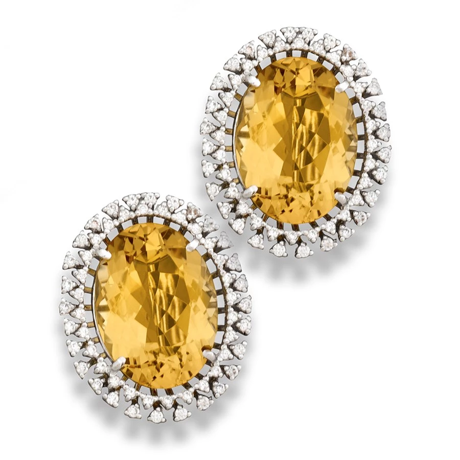 A beautiful statement and part of an exquisite set, the 18k white gold earrings bear hand cut oval yellow beryl (16 tcw), guaranteed to awe in any setting. Features diamond embellishments (0.728 tcw), all prong set in gorgeous filligree 18k white gold handiwork. Handmade in Brazil.