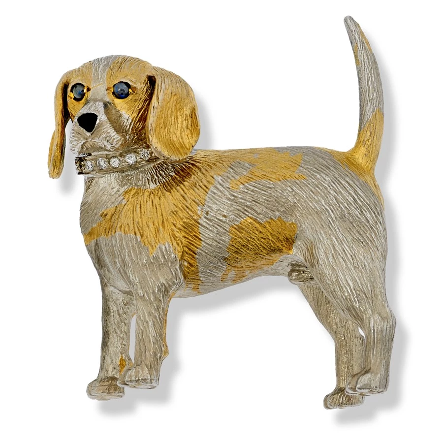 Attractive beagle pin is 18k white and yellow gold with diamonds (.05cts) set into its collar. Handmade in England. Exclusively at Scully & Scully.
