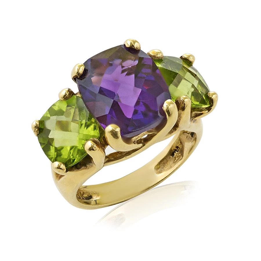 This beautiful three stone ring features a bold amethyst (5 cts) bordered by two peridot (4.4 cts). The 18k yellow gold interlocking prong gem settings create a charming tree branch inspired finish. Handmade in America.