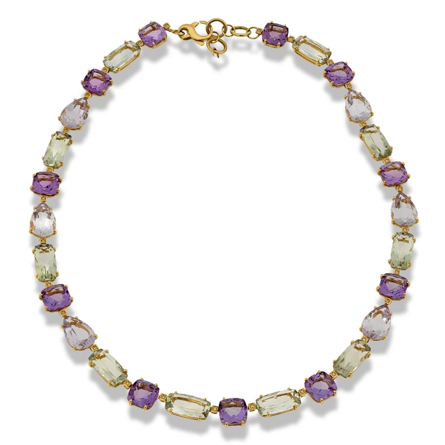 This warm, stunning and dazzling necklace consists of purple amethyst, pink amethyst, and green prasiolite gems (79.85 tcw). With the necklace set in 18k yellow gold, the 3 different gemstone colors just add to the allure. Accented with diamonds (0.168 tcw) between each gemstone. Handmade in Brazil.