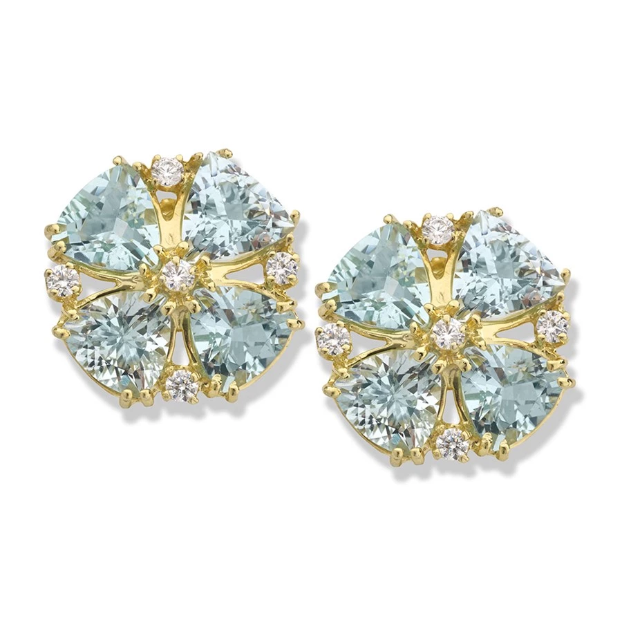 Subtle and elegant cross earrings formed of four aquamarines (10.64 cts) and enhanced with diamonds (.40 cts), all set into 18k yellow gold. Handmade in America.Â