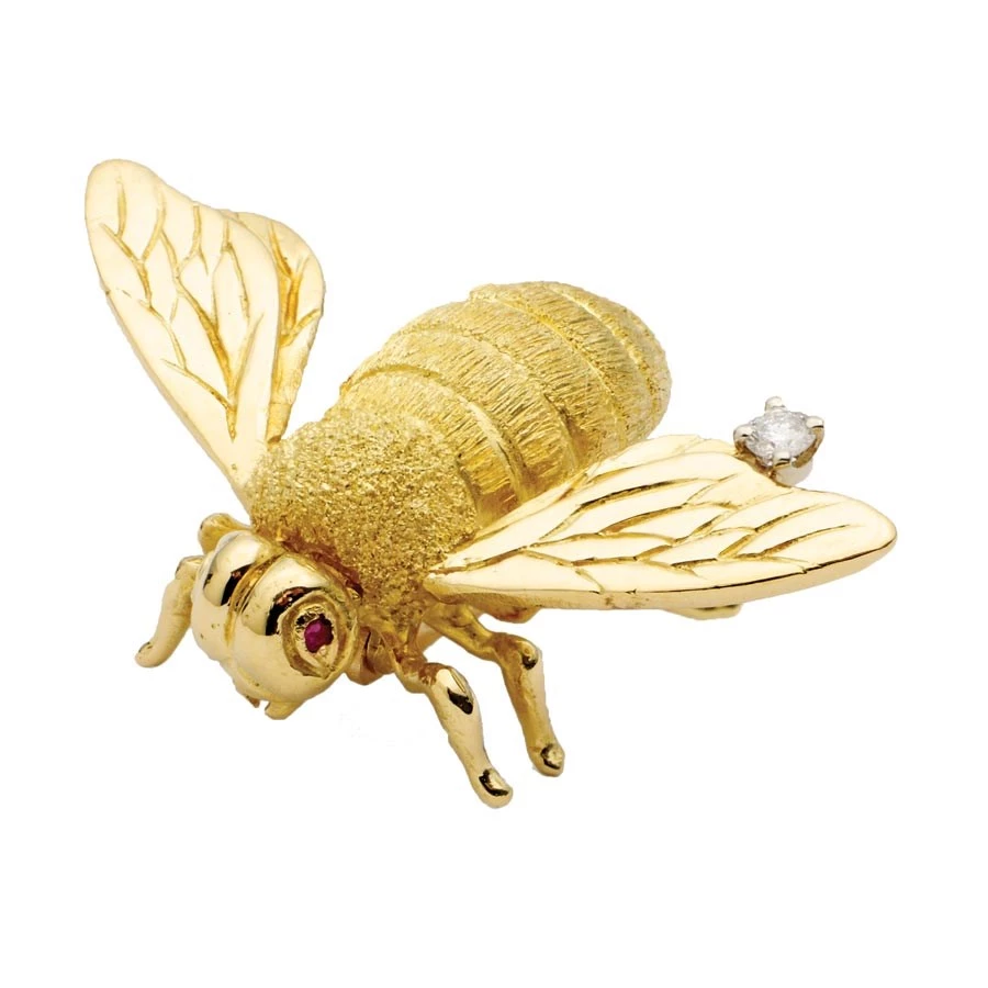Create a buzz wherever you go! Beautifully textured bee pin has a sparkling diamond on its wing (.04 ct) and rich ruby eyes (.08 ct). Handmade in America.