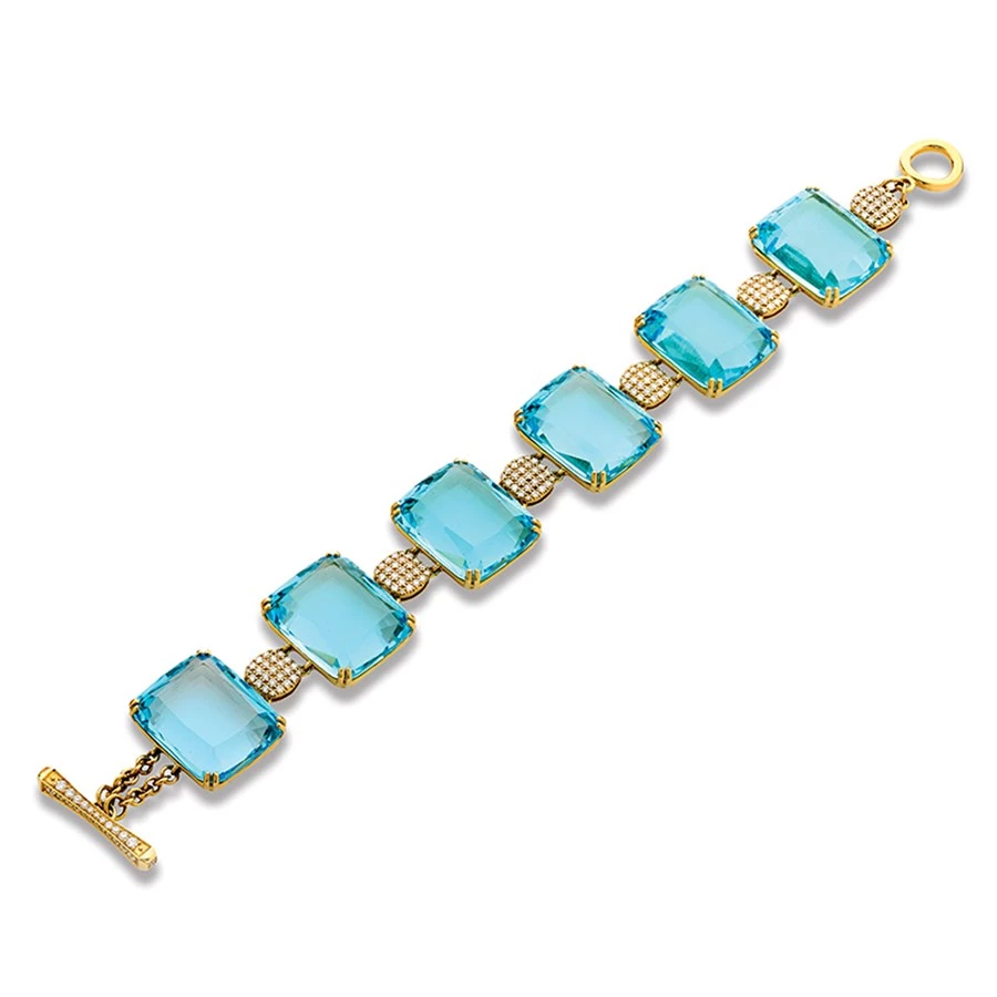 Elegant and eye-grabbing bracelet, featuring faceted flat cushion gemstones of blue topaz (134 tcw). The precious gems are prong set by hand into 18k yellow gold, and linked with cushions of gold studded with dazzling pave diamonds (1.60 tcw).