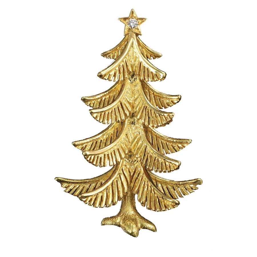 18k textured yellow gold Christmas Tree pin. The gently sloping branches are accented by a beautiful diamond (.06 cts) star on top. Handmade in America.