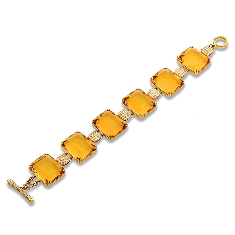 Elegant and eye-grabbing bracelet, featuring faceted flat cushion gemstones of honey citrine (95.66 tcw). The precious gems are prong set by hand into 18k yellow gold, and linked with cushions of gold studded with dazzling pave diamonds (1.60 tcw).