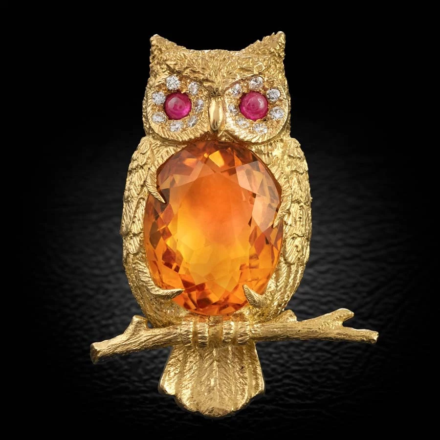 Striking 18k yellow gold owl has citrine body (9.24 cts) and ruby cabochon eyes surrounded with diamonds (.15 tcw). Handmade in England. Exclusively at Scully & Scully.Â