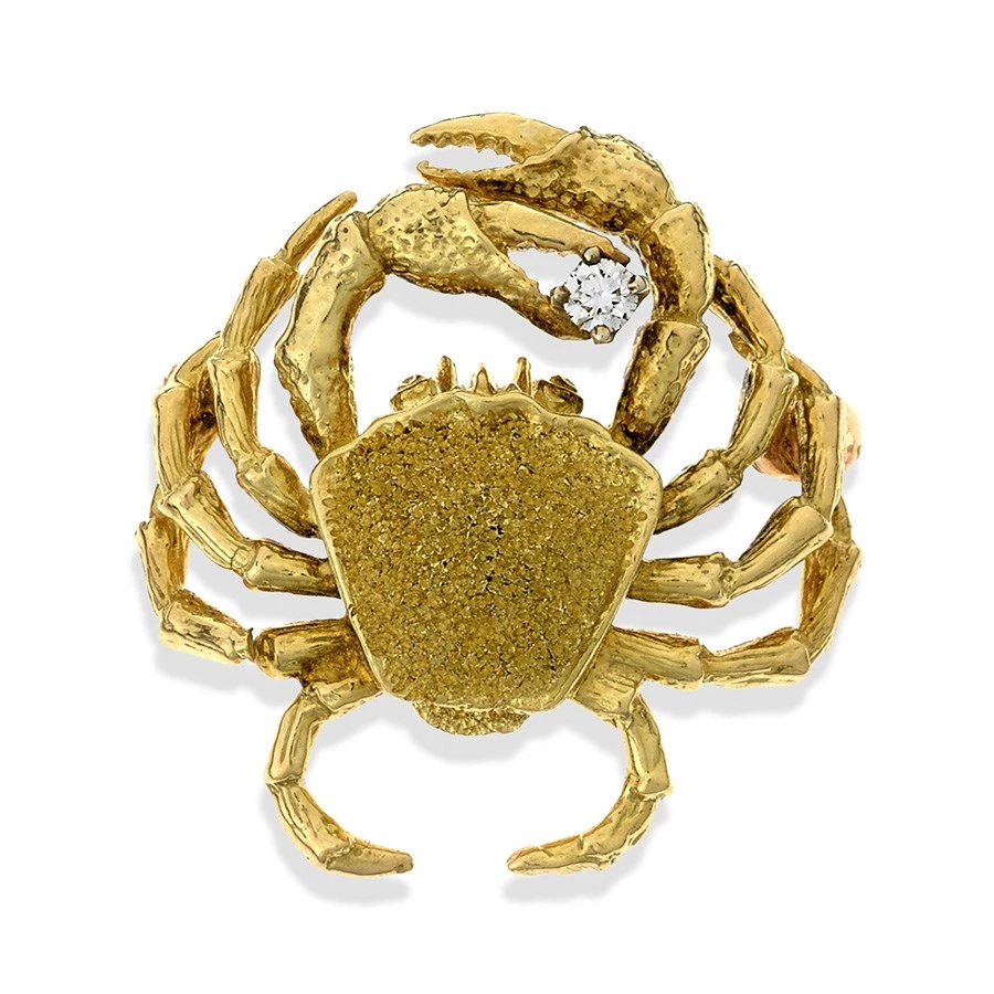 Showcase your love of the ocean with an 18k Yellow Gold Crab Pin. Each pin is crafted from highly textured 18k gold with a brilliant accent diamond in one claw. Handmade in America.