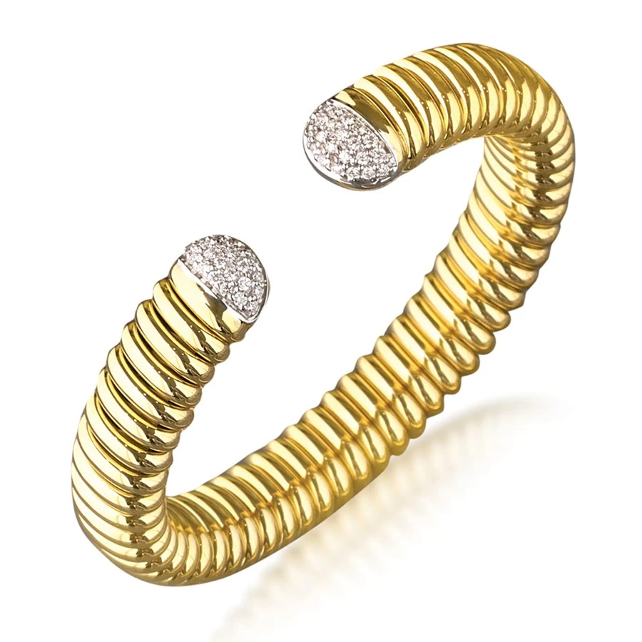 18k yellow gold is expertly handcrafted into an elegant cuff bangle to complement any wrist. The 18k yellow gold is capped on each end of the cuff with 18k white gold, hand-set with pave diamonds (0.69 tcw) for a delightfully sparkling finish. Handmade in Italy.