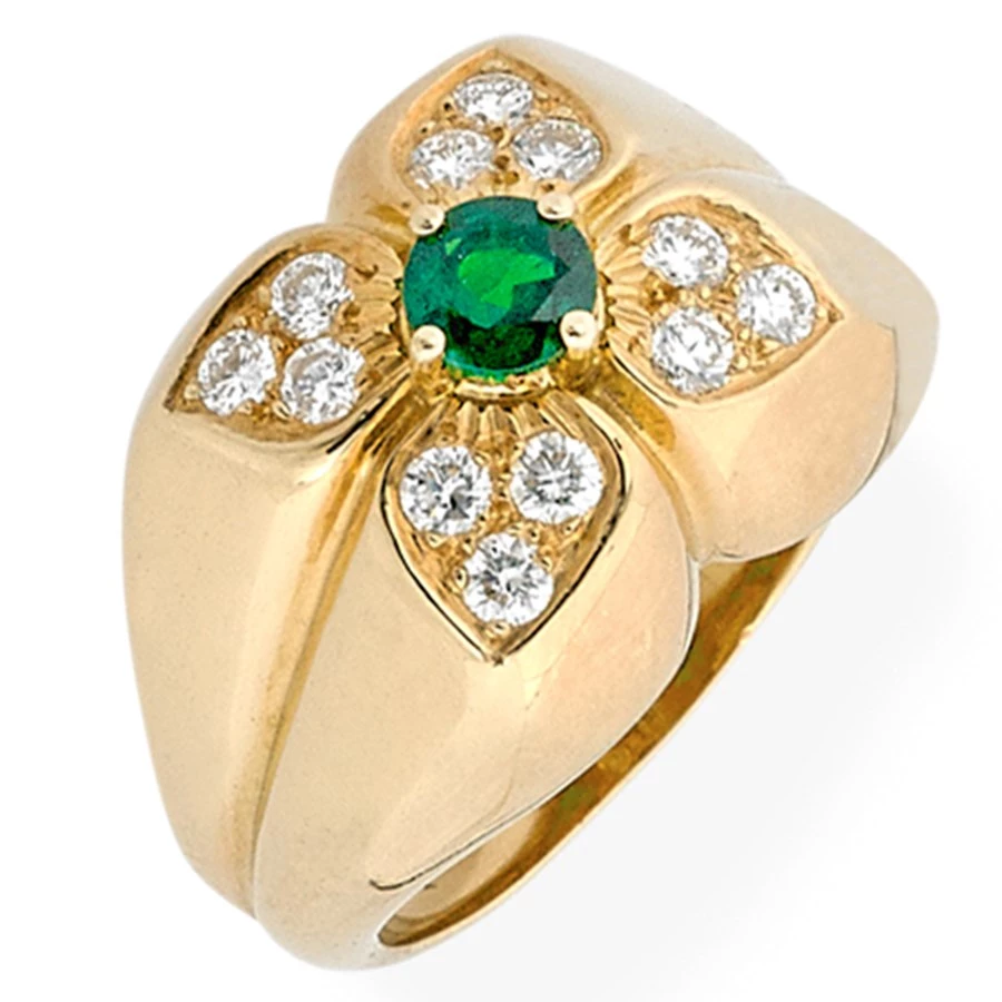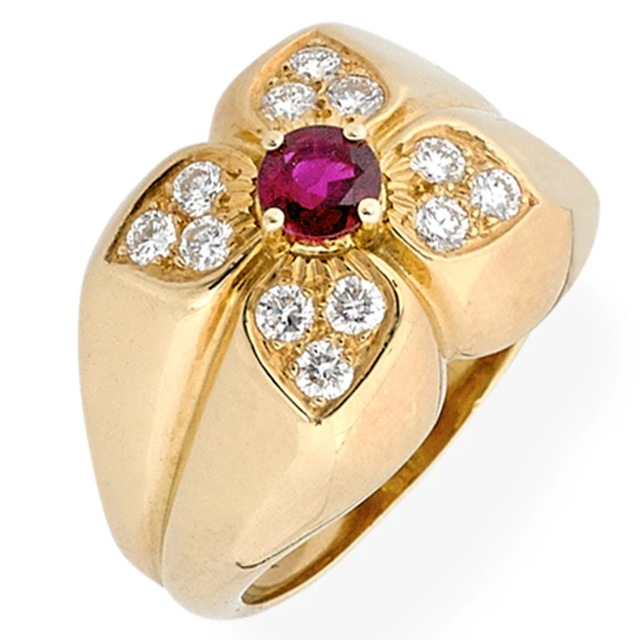 Beautiful 18k yellow gold four petal rings with 12 round brilliant cut diamonds (.45 cts) and colored stone centers (Emerald is .30 cts; Ruby is .45 cts). Handmade in America.