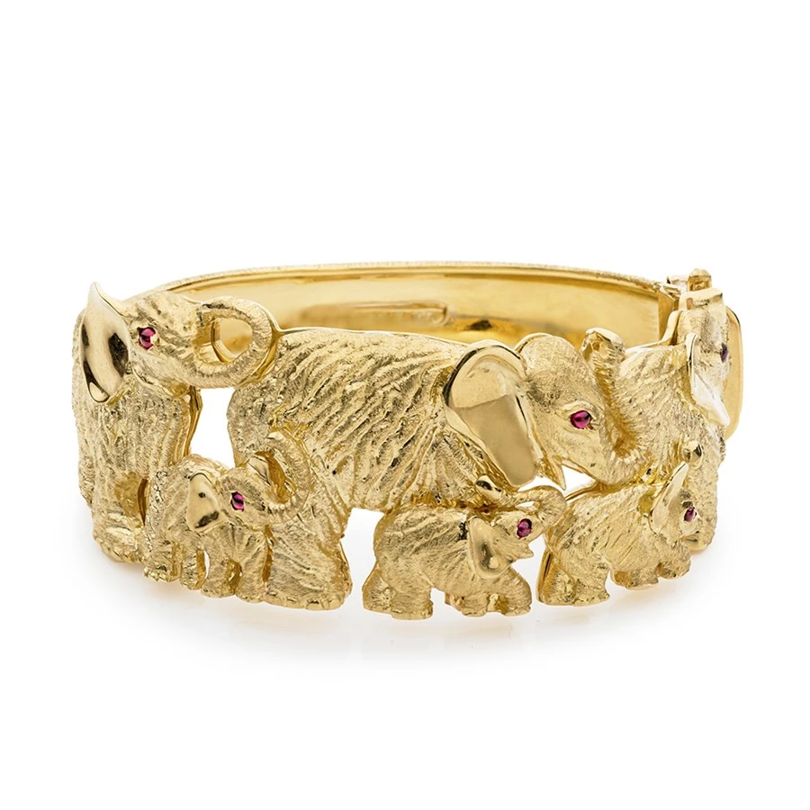 Both majestic and adorable, this charming bracelet features a family of elephants handcrafted from 18k yellow gold. The artist uses ribbons of gold to capture the folds of skin, and smooths the precious metal for ears and toes. Each elephant has a ruby cabochon eye. Handmade in America.