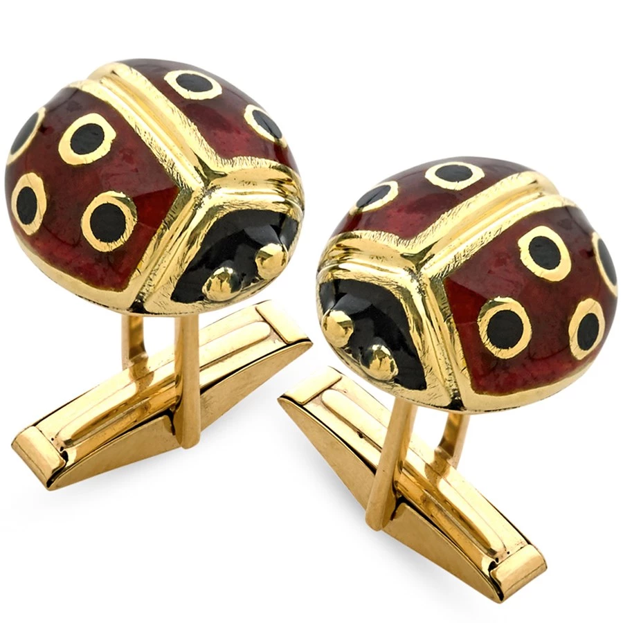 Handmade from 18k yellow gold, each cufflink is hand-enameled to create an impressively styled ladybug. The rich red and black enamel contrasts with the luxe gold.