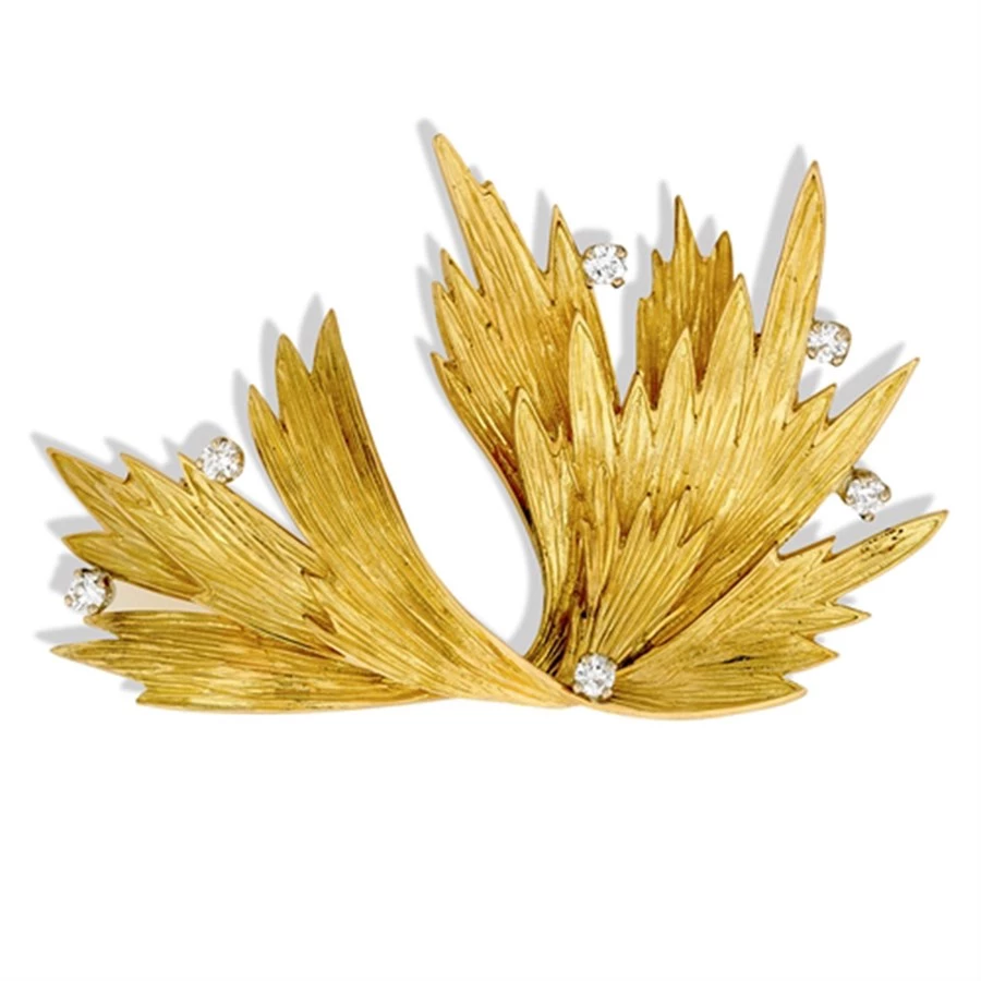 18k yellow gold spray flame brooch with 6 round brilliant cut diamonds (.60 tcw). Handmade in America.